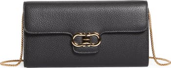 Gleaming double-Gancio hardware details the flap of this calfskin-leather wallet designed with a well-organized interior and removable chain crossbody strap.