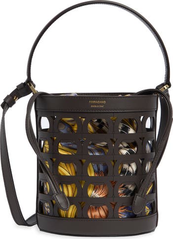 House-signature Gancios are artfully layered to create the bucket-shaped body of this leather bag lined with a floral-patterned silk pouch.