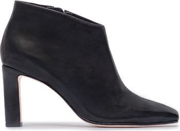 Sharp and Polished. This daring shootie’s simplicity exudes sophistication with a contemporary square toe and an asymmetric silhouette.