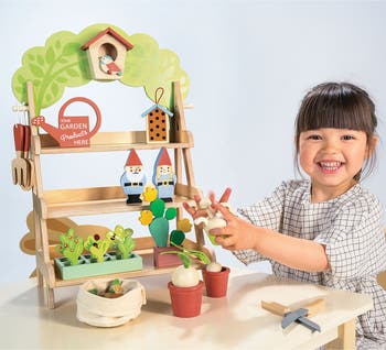- Includes stand, trowel, fork, garden shears, bird house and bird, insect box, seedling tray, bag of fabric and wooden bulbs, two pots, water sprayer, watering can, cactus and two gnomes