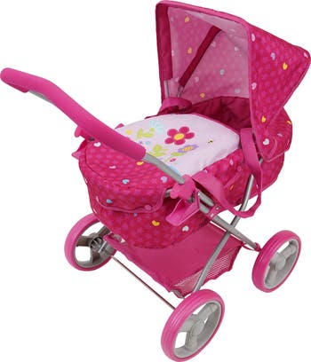 Very cute half folding 509 Baby Doll Garden Pram made with steel tube frame featuring a retractable canopy and large shopping basket. Fits Dolls up to 18 inches. The Pram’s fun bright fabric is a durable polyester which can be hand washed, the parent handle is a nice comfortable foam, and the two-tone wheels complement the overall look. This 509 Pram also includes a safety lock system that prevents a sudden or unexpected collapse, both side safety latches must be lifted to fold for storage or travel. Height of the Pram is 24 inches, perfect for Kids 3 years and up. **Doll not included**.