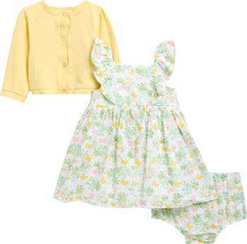 Your tiny trendsetter can take on warm-weather parties in this all-cotton set featuring a pinafore-style dress, matching bloomers and a coordinated cardigan.