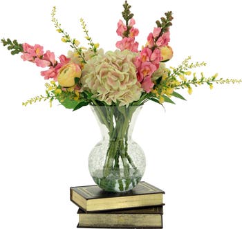 This charming arrangement features 3 soft hydrangea blooms paired with 3 delicate pink snapdragons and 3 buttery yellow ranuculas. Airy yellow accents and greenery create a fresh, garden-inspired look. Displayed in a clear glass vase, it adds a bright and elegant touch to any tabletop or home décor.