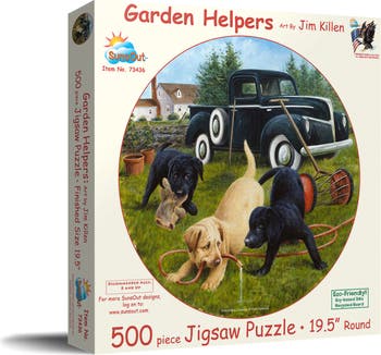 Uncover the tranquility of the Garden Helpers 500 piece jigsaw puzzle for adults, showcasing exquisite art by Jim Killen. This round puzzle, detailing a serene garden landscape, measures 19.5 inches when assembled, providing an astounding balance of challenge and relaxation for personal enjoyment or as a thoughtful gift. Renowned for their unrivaled quality, SunsOut's puzzles are crafted with precision, interlocking smoothly to ensure users at any level can assemble without frustration. Utilizing high-quality recycled cardboard, this eco-friendly product offers consistent durability with the superior feel of a SunsOut puzzle. The vibrant depiction of Jim Killen's licensed artwork featuring lively dogs and vintage vehicles set in a flourishing garden enhances the puzzle experience. The Garden Helpers puzzle comes in a detailed full-color display box that adds aesthetic charm to any collection. SunsOut Puzzles, a proud woman-owned business located in the USA, not only guarantees a hassle-free experience by swiftly replacing any missing or damaged pieces but also shows a commitment to sustainability through the use of eco-friendly soy-based inks and recycled materials tailored for jigsaw puzzles. This puzzle stands as more than just a hobby; it's a testimony to skilled craftsmanship and a sustainable future. Enjoy the refreshing experience of puzzling with the Garden Helpers jigsaw puzzle, and support sustainability and creative arts.