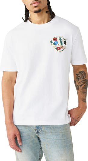 Flex in florals with this heavyweight-cotton T-shirt flaunting puff-printed graphics at the chest and back.