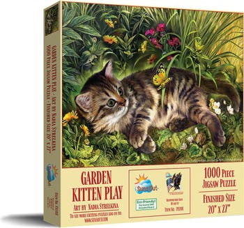 Step into a world where nature and play intertwine with SunsOut's Garden Kitten Play 1000 piece jigsaw puzzle, showcasing a whimsical scene of a kitten exploring a vibrant garden, a delightful masterpiece by the talented Nadia Strelkina. Measuring 20" x 27" when completed, each piece promises hours of tranquil pleasure and a journey into serenity for adults. Crafted with durable, interlocking pieces made with high-quality recycled cardboard, this American-made puzzle ensures a frustration-free assembly. Adding to its appeal is SunsOut's commitment to using eco-friendly soy-based inks and recycled materials in their manufacturing processes. This commitment transforms each puzzle into not only a work of art but a testament to responsible manufacturing practices. SunsOut’s rigorous quality control provides a worry-free guarantee for puzzle enthusiasts, promising to resolve any issues promptly with missing or damaged pieces. Knowing that your enjoyment is as significant as the masterpiece you are building, SunsOut offers an enchanting blend of art, nature, and premium craftsmanship in this puzzle. Experience the charm of the Garden Kitten Play puzzle and celebrate the artistry of Nadia Strelkina while supporting a woman-owned small business that values both creativity and the environment.