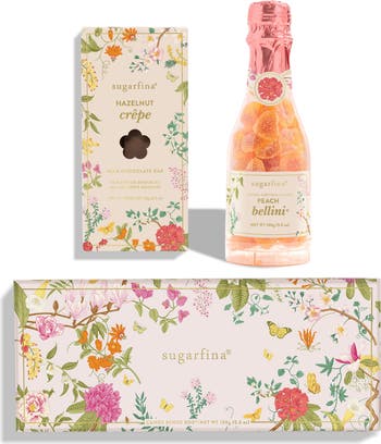 Celebrate the blossoming flowers and sunlight of the changing season with this botanical-patterned gift set filled with elegant transparent cubes stuffed with three of the brand's favorite artisan confections, as well as a chocolate bar and a celebration bottle.