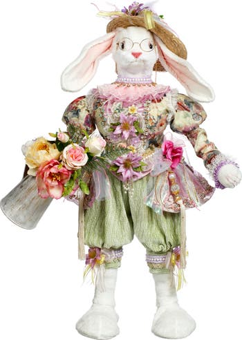 The Mark Roberts Garden Party Rabbit stands 33 inches tall and holds a charming watering can filled with flowers. Dressed in elegant garden-inspired attire, it wears a festive hat accented with floral details that enhance its whimsical appeal. With signature Mark Roberts craftsmanship, this piece makes a delightful statement for spring, Easter, or garden-themed décor displays.