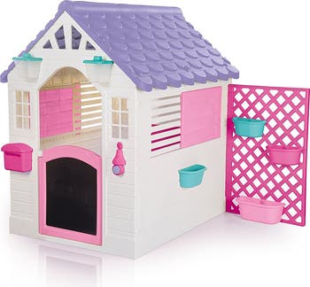 - WHIMSICAL TOUCHES FOR ADDED CHARM: Features a purple roof, a pink fence, a mailbox and hanging baskets that can store toys or hold real or pretend flowers. Every detail adds to the playful, homey feel.