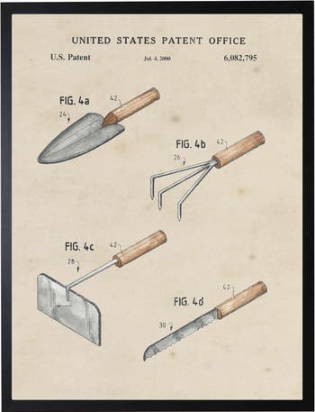 This vintage-inspired print, framed in a black wooden frame, features a garden tools patent. Sized at 16 inches by 20 inches, this made in the USA frame makes for a beautiful addition to any wall.