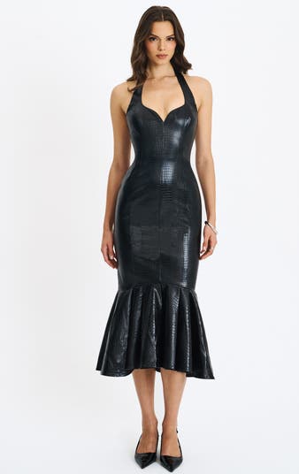 Gardenia Faux Leather Midi Sweetheart Halter Flared Dress