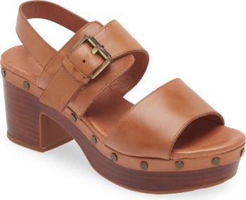 Antique midsole studs add retro-cool styling to a slingback leather sandal lifted by a stacked platform and block heel.