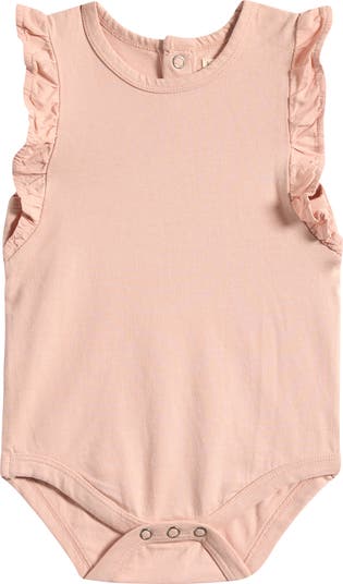 Flutter sleeves frame an organic-cotton bodysuit boasting a soft handfeel and vintage washed look.