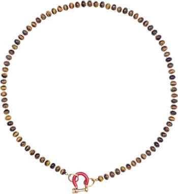 Elevate your style with the Garth necklace, featuring stunning 24-inch tiger eye beads complemented by 14k gold plated hardware and an enamel carabiner. Perfect for any occasion.