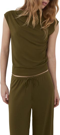 Pleated gathering at one shoulder creates a modern, asymmetric look on this jersey top cut in a figure-skimming silhouette.