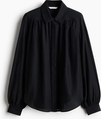 Oversized blouse in an airy viscose and cotton weave with a collar and concealed button band down the front. Double-layered yoke with gathers at the front and back and long balloon sleeves with buttoned cuffs.