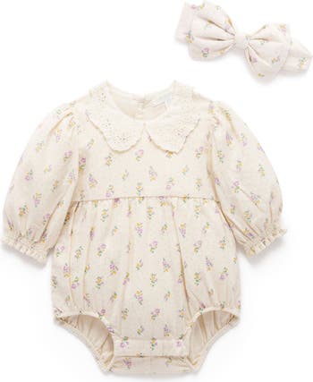 Our Primrose Gathered Bodysuit Set is a sweet all-in-one style for those special occasions with your little one. Featuring a bodysuit with a pretty lace collar, designed in a balloon style with gathers at the chest for a comfy fit, and matching bow headband. Made from warm 100% Cotton flannelette with a sweet all over floral print. Pair with a cardigan and tights and for a cute look.