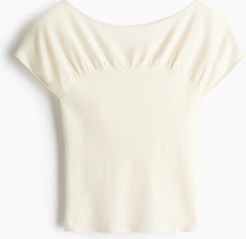 Short, fitted top in a soft, fine-knit viscose blend with a delicate boat neckline and cap sleeves. Gathered seam across the chest to create a ruched effect on the top part.