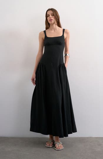 Gathered seaming gives shape to this linen-enhanced maxi dress made on-seam pockets at the skirt.