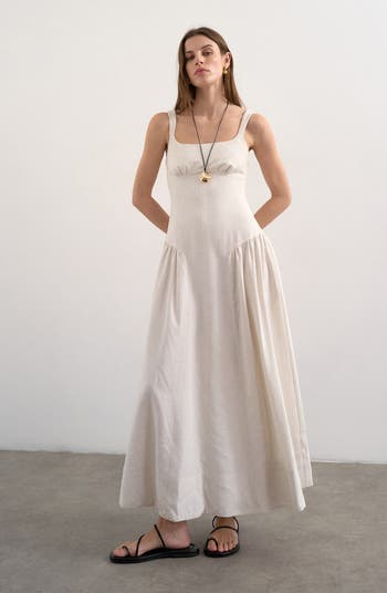 Gathered seaming gives shape to this linen-enhanced maxi dress made on-seam pockets at the skirt.
