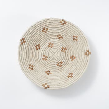 - Made from all natural, sustainably sourced raffia and banana fibers Hanging loop on back allows basket to be wall decor in addition to tabletop use Weavers hand make each basket from home while tending to other household duties. Baskets can take days to weeks to complete with artists weaving 3 or so hours per day while balancing other responsibilities. No two baskets are identical - there will be slight variations in size and color from the one shown due to the handmade nature of each product. Each basket is both special and unique. HANDMADE IN UGANDA APPROXIMATE SIZE: 13" x 3. 5"