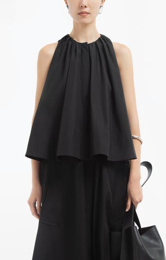 A sleeveless tunic cut in crisp cotton sateen with a soft sheen. Gentle gathering at the neckline gives quiet volume and an easy A-line shape. The high–low hem lifts away from the body and adds movement.