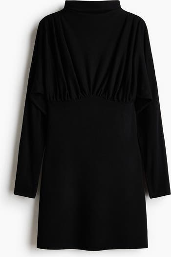 Short dress in jersey with a turtle neck, pleats on the shoulders, long sleeves and a gathered seam under the bust.