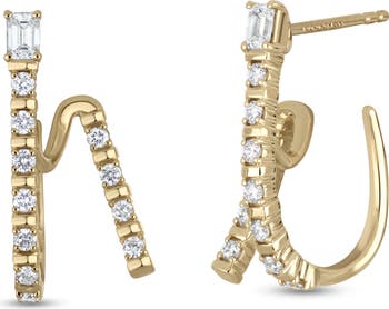 Fiery rows of round diamonds intensify the sparkle of these asymmetric hoop earrings handcrafted from 18-karat gold.