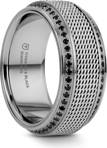 The Gauntlet Steel Chain Titanium Wedding Ring features a unique steel chain center and polished beveled edges set with round black diamonds. With 0.5 total carats of black diamonds, this ring offers exceptional durability and style.
