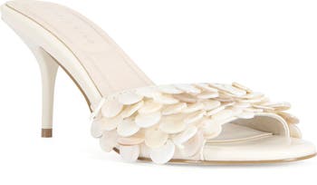 Circular sequin embellishments enrich the strap on a minimalist slide sandal shaped from faux leather and set on a tapered pin heel.