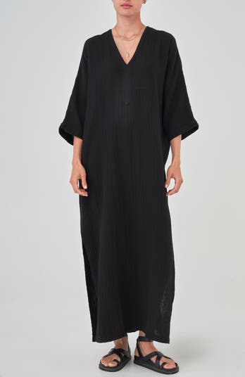 You asked, we delivered: a new cotton gauze caftan with the perfect balance of fit and flow! The arc seam detail on the front combined with the deep pleat on the back creates a flattering fit that drapes the body perfectly without overwhelming. The drop shoulder provides for a roomy top that gently tapers towards the hip for a super flattering shape. With 3/4 length sleeves and side slits, this one is pool-party and lounge-worthy perfect. In our ever-popular cotton gauze, this one is as easy-care, easy-wear as it gets.