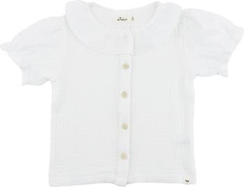 The Layla Blouse brings effortless style to everyday wear. Crafted from breathable gauze, this charming top features a standout wide ruffle collar, functional button-down front, and delightful short puff sleeves that capture that playful spirit. The creamy oyster hue is endlessly mixable, making it a go-to piece for layering or wearing solo. Soft, breathable, and ready for whatever the day brings. Available in infant, toddler and girls' sizes. Designed in Minnesota