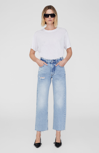 The cropped, boyfriend-inspired Gavin Jean is cut from midweight regenerative cotton with no stretch. It features a relaxed-straight fit and mid-to-high rise with a button fly, cropped inseam, and raw-edge hem.