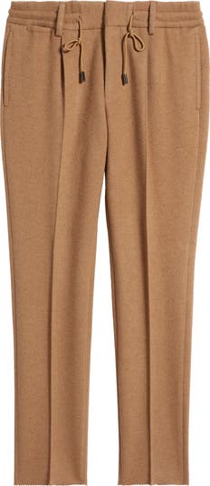 A comfy drawstring waist defines these charming, casual pants crafted from a textured camel hair blend in a tapered fit.