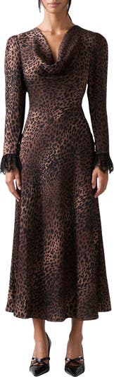 Make a stunning statement in this A-line dress featuring a cowl neck, energetic leopard print and lace-trimmed sleeves.