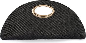 Gleaming cutout handles highlight the striking crescent shape of this woven straw clutch outfitted with an optional chain strap.