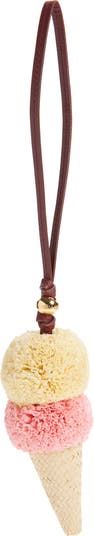 Pompom scoops and a woven cone create a textured bag charm that turns your favorite accessory into a playful statement.