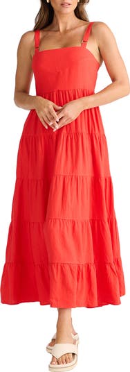 A fitted bodice and clean square neckline balance the easy volume of this tiered fit-and-flare maxi dress.