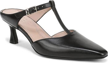 An adjustable T-strap offers a secure fit on a leather mule featuring a slender snip toe and kitten heel for walkable balance. Signature Contour+ Comfort technology and REZORB cushioning provide endless comfort and shock-absorption while on your feet.