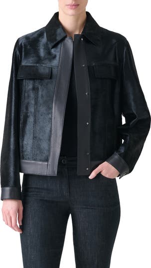 Akris reimagines the classic trucker jacket with this showstopping style made from genuine calf hair and trimmed in calfskin leather.