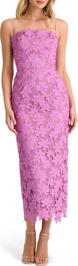 Broderie anglaise brings romance and texture to this figure-skimming midi dress suspended by supportive, adjustable straps. An airy back slit grants graceful movement as you saunter from dinner to dancefloor.