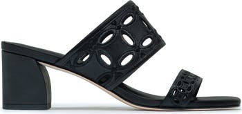 Stepping up. Gemma wears our artful cutout detailing charmed by floral embroidery motifs across a double strap mid heel sandal. Add some texture and height to your spring looks in fun meets refined fashion.