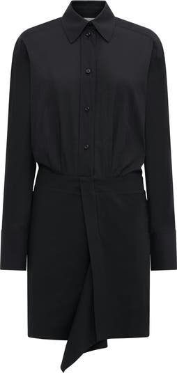 A long sleeve shirt dress that features an oversized,point collar, button front, long sleeve bodice, tucked into a slim skirt silhouette that has a wrap front panel. The dress is made from a voile poplin. Front wrap closure.