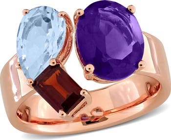 This vibrant open ring showcases a combination of multicolor gemstones, all set in rose-plated sterling silver. The large oval-cut amethyst is complemented by a pear-shaped blue topaz and an octagon-cut garnet, creating a striking contrast of bold colors. The rose-plated sterling silver adds a warm, luxurious touch to the design, making this ring a unique and stylish statement piece.
