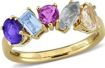 This vibrant ring features a combining array of gemstones, including a pear, baguette, marquise, oval and round-shapes all set in rose-plated sterling silver (option in yellow-plated sterling silver). The varied shapes and rich colors of the gemstones create a unique and eye-catching design, while the warm sterling silver enhances the luxurious feel of the piece. This bold and colorful ring is perfect for making a statement, adding a playful yet elegant touch to any outfit.