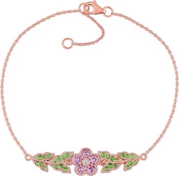 Delicate pink sapphires and vibrant tsavorites accented with sparkling diamonds form a graceful floral cluster on this bar bracelet in 10k rose gold. Its refined design blends elegance with charm, perfect for adding a romantic touch to everyday style or special occasions. A timeless piece that radiates beauty and sophistication effortlessly.