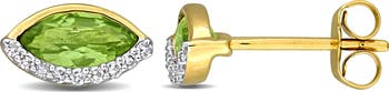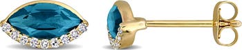 These elegant stud earrings feature marquise-cut gemstone, set in luxurious 14K gold. The hue of the gemstones is complemented by sparkling diamonds gracefully lining the edge of the setting. The combination of the vibrant gemstone and soft gold creates a warm and sophisticated look, perfect for making a bold statement while adding a touch of refined elegance to any outfit.