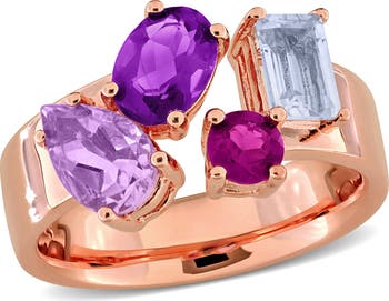 This vibrant open ring features a combining array of gemstones, including a pear-shaped blue topaz (option with pink amethyst), an oval Madeira citrine (option with amethyst), a baguette-cut green quartz (option with blue topaz), and a round pink amethyst (option with rhodolite), all set in sterling silver. The varied shapes and rich colors of the gemstones create a unique and eye-catching design, while the warm sterling silver enhances the luxurious feel of the piece. This bold and colorful ring is perfect for making a statement, adding a playful yet elegant touch to any outfit.