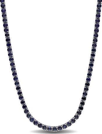 This opulent tennis necklace is crafted in glistening 14k gold. This flawless necklace features prong-set natural precious gemstones (options: pink sapphire in 14k rose gold, blue sapphire in 14k white gold, ruby in 14k yellow gold). This exquisite necklace measures 16.5-inches in length and is comfortably secured with a safety clasp. Enhanced with a high polished finish, this classic necklace is sure to give you a queenly look.