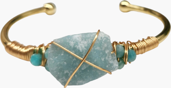 Express your raw beauty with this exquisite Gemstone Wire-Wrapped Bracelet. Each comes with rough semi-precious crystal gemstones or pearl woven securely to a smooth band with 18kt. gold overlay.